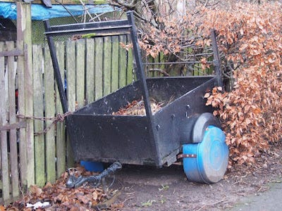 IMAGE SIX: Nothing is too small for the industriousness of the Scottish vandal, as displayed by this humble leaf-collecting cart with its vandal-resistant wheel coverings made from the same material that protects the space shuttle on its re-entry. However, a determined gang of Scottish "weans" or "wee neds" with a cigarette lighter will be able to turn this tough, fire-resistant plastic into a blackened blob in under 24 hours.