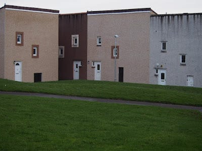 IMAGE TWO: Bourtrehill, one of the rougher suburbs of Irvine, my home town. Notice the "windaes." These are loosely based on English “windows” but much smaller in order to help improve the stone throwing ability of Scottish vandals. The wheelie bins are safely stored in underground bunkers otherwise they would certainly be set on fire.